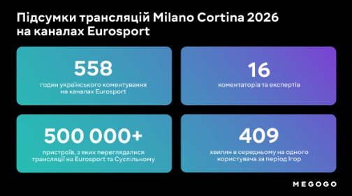 Медіасервіс MEGOGO підбив підсумки трансляцій Зимових Олімпійських ігор Milano Cortina 2026 на каналах Eurosport 1, Eurosport 2 та Eurosport 4K з українською аудіодоріжкою, яку забезпечила власна команда сервісу в межах співпраці з Warner Bros. Discovery.